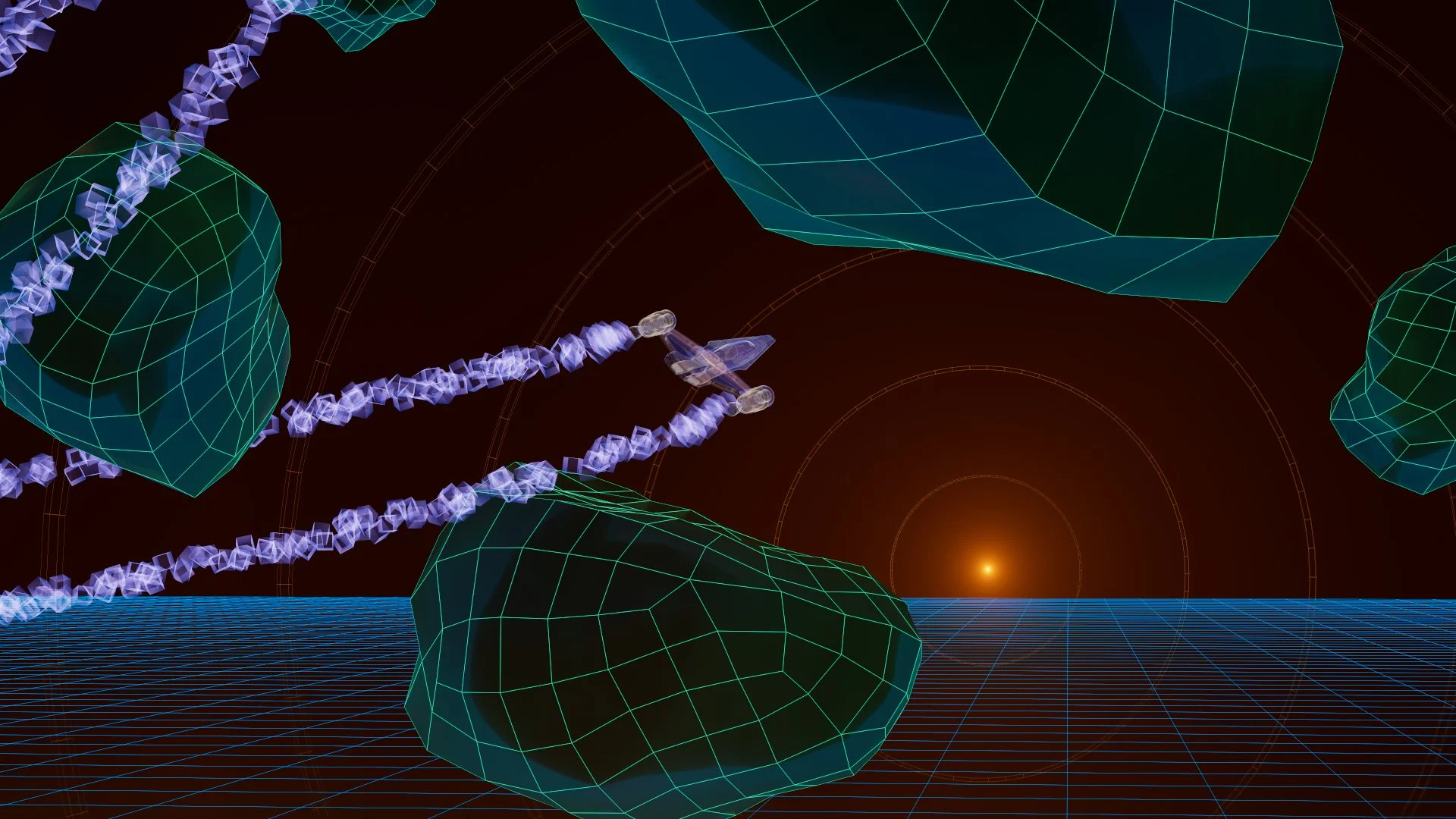 The spacecraft’s launch marks the start of the AI process. Crossing the rift signals the shift from human input to computation. Wireframe asteroids symbolize errors and hallucinations, while the central base represents a powerful AI model that returns clean results.